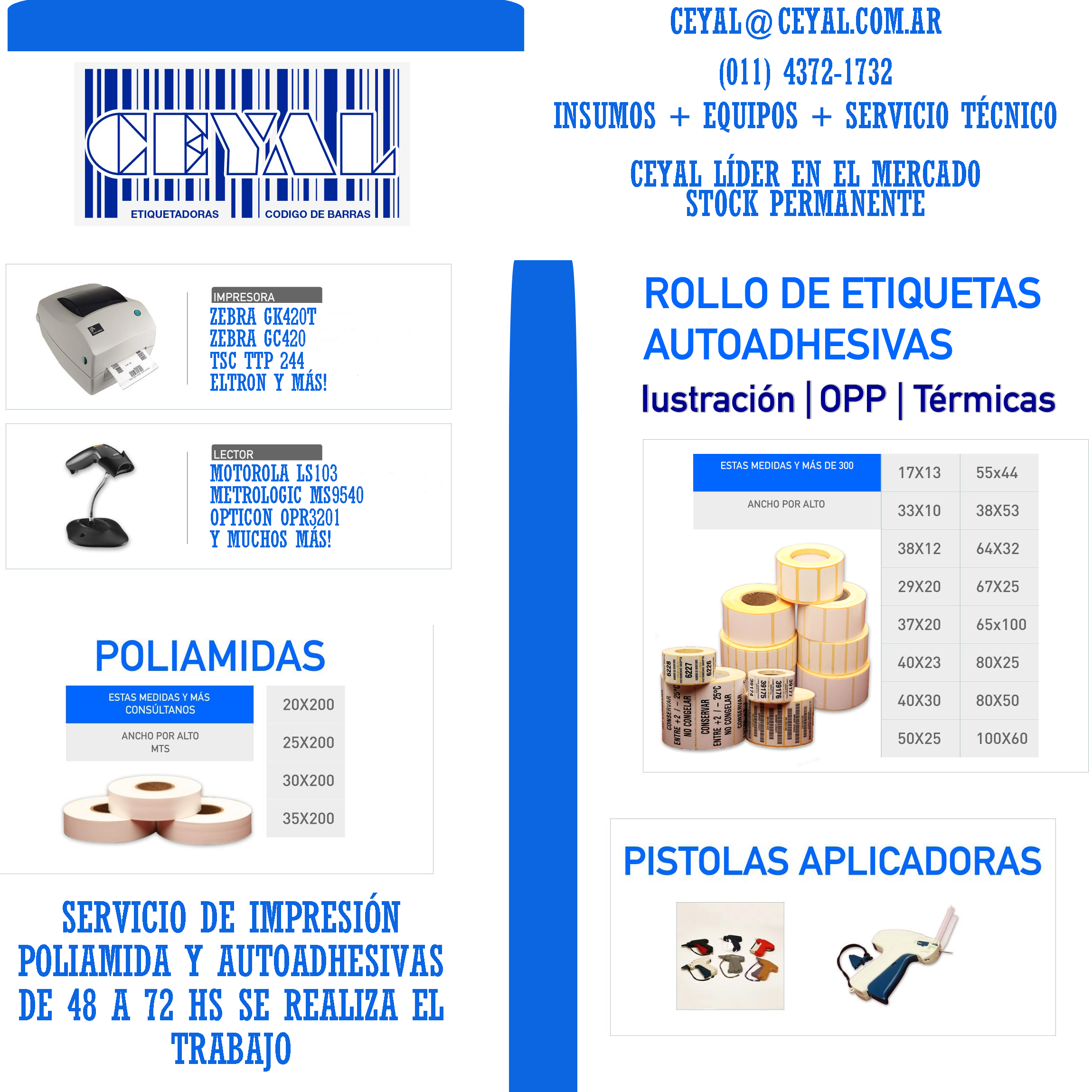 Tambien podes consultarnos por: *Etiquetadora manual, *Dispensadora de etiquetas, *Etiquetadora Opentex, *Sujetadores plasticos, *Pistolas aplicadoras, *Ribbons, *Lectores laser de codigos de barras, *Servicio de impresión, *Servicio tecnico, *Etiquetas autoadhesivas, *Etiquetas de composicion, fasco, poliamida.